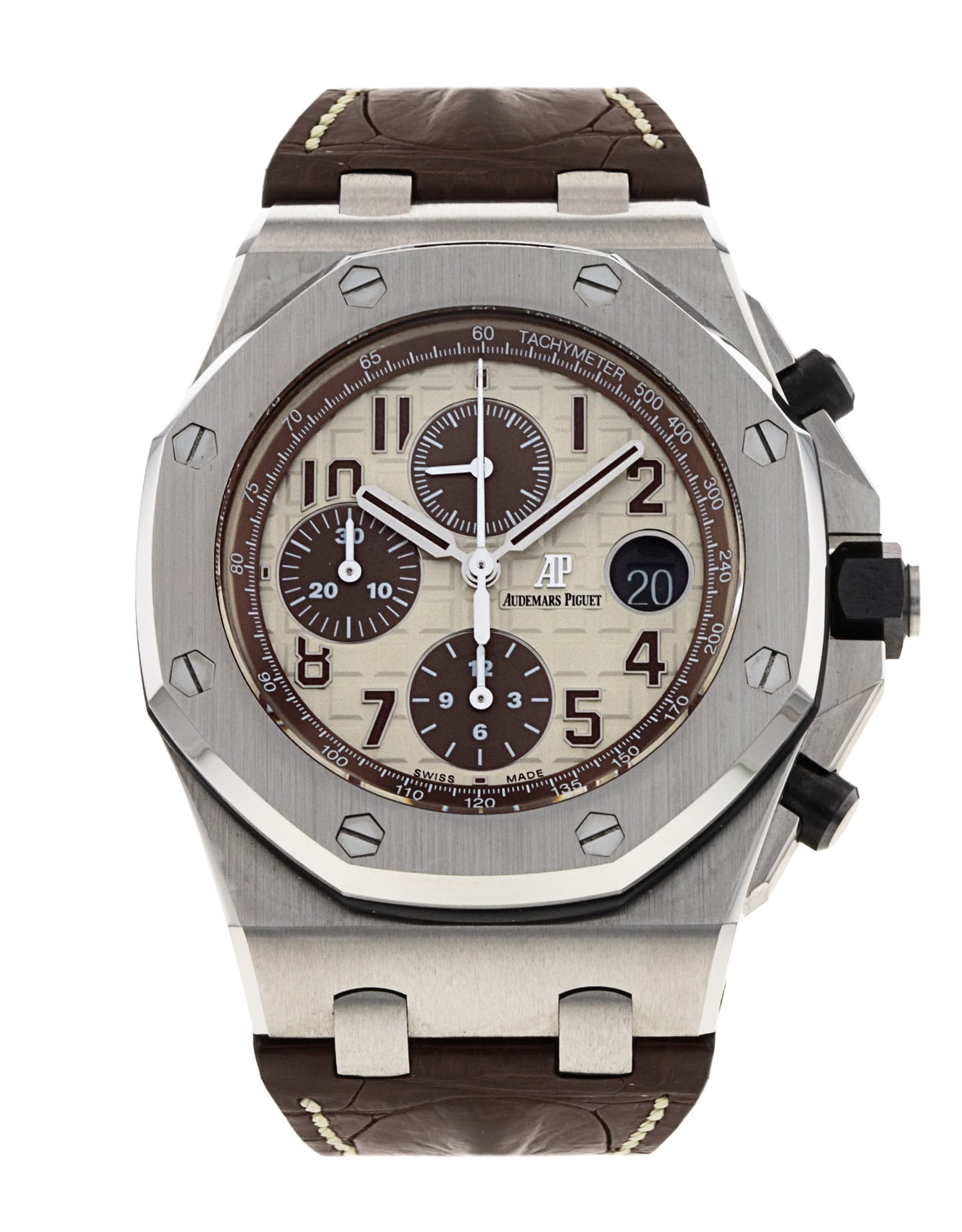This Audemars Piguet Royal Oak Offshore 26470ST.OO.A801CR.01 has a ivory arabic dial and a leather strap. This Audemars Piguet has undergone a thorough inspection of accuracy, functionality and condition at our Audemars Piguet certified service centre to determine the level of reconditioning required to meet our strict standards. It has also been checked against our records to ensure authenticity. All our watches have a 24-month warranty for your peace of mind.
