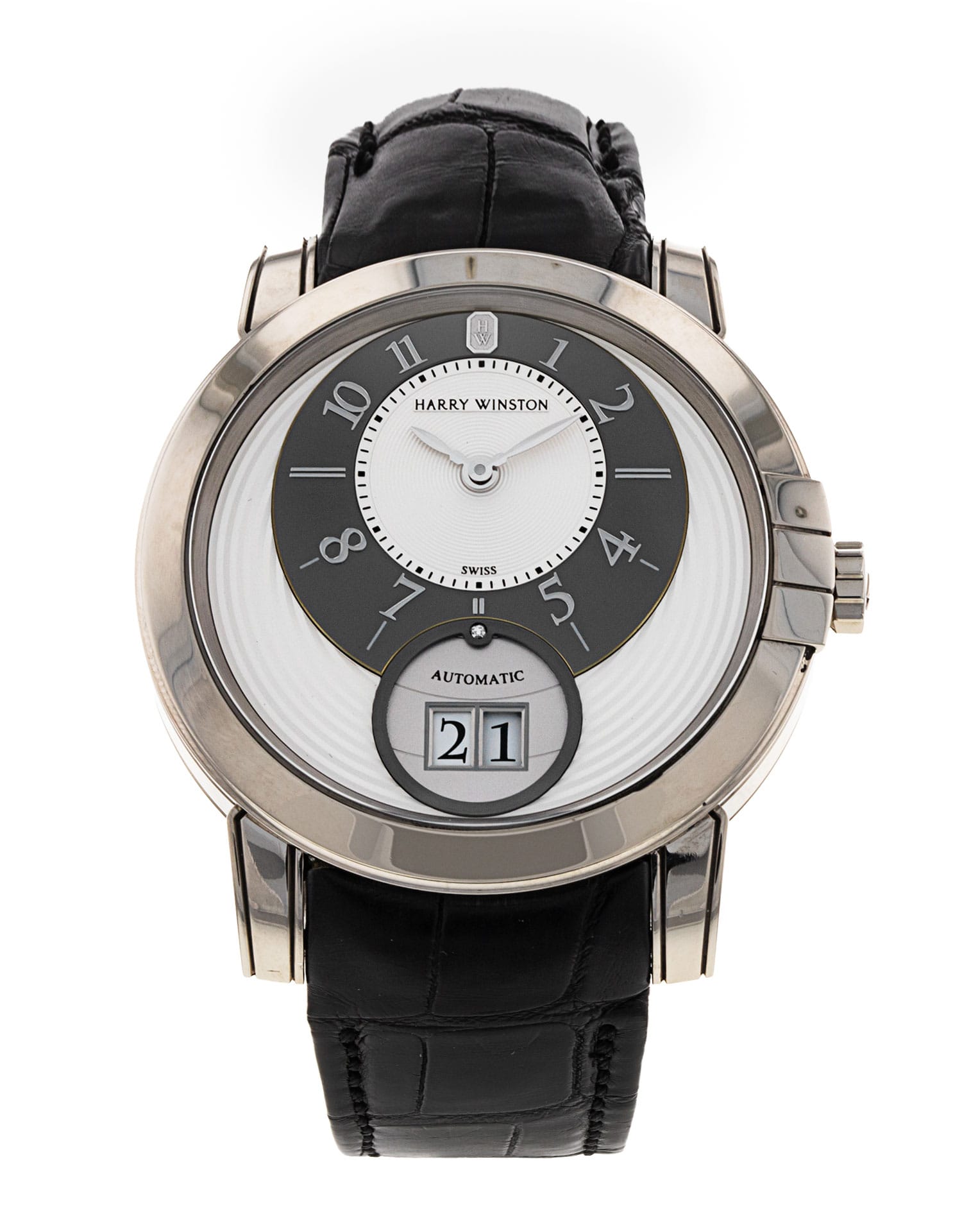 This Harry Winston Midnight MIDABD42WW001 has a silver dial and a leather strap. This Harry Winston has undergone a thorough inspection of water resistance, accuracy, functionality and condition to determine the level of reconditioning required to meet our strict standards. It has also been referenced against technical documents and manufacturer records where available to ensure authenticity and a clean history. All our watches have a 24-month warranty for your peace of mind.