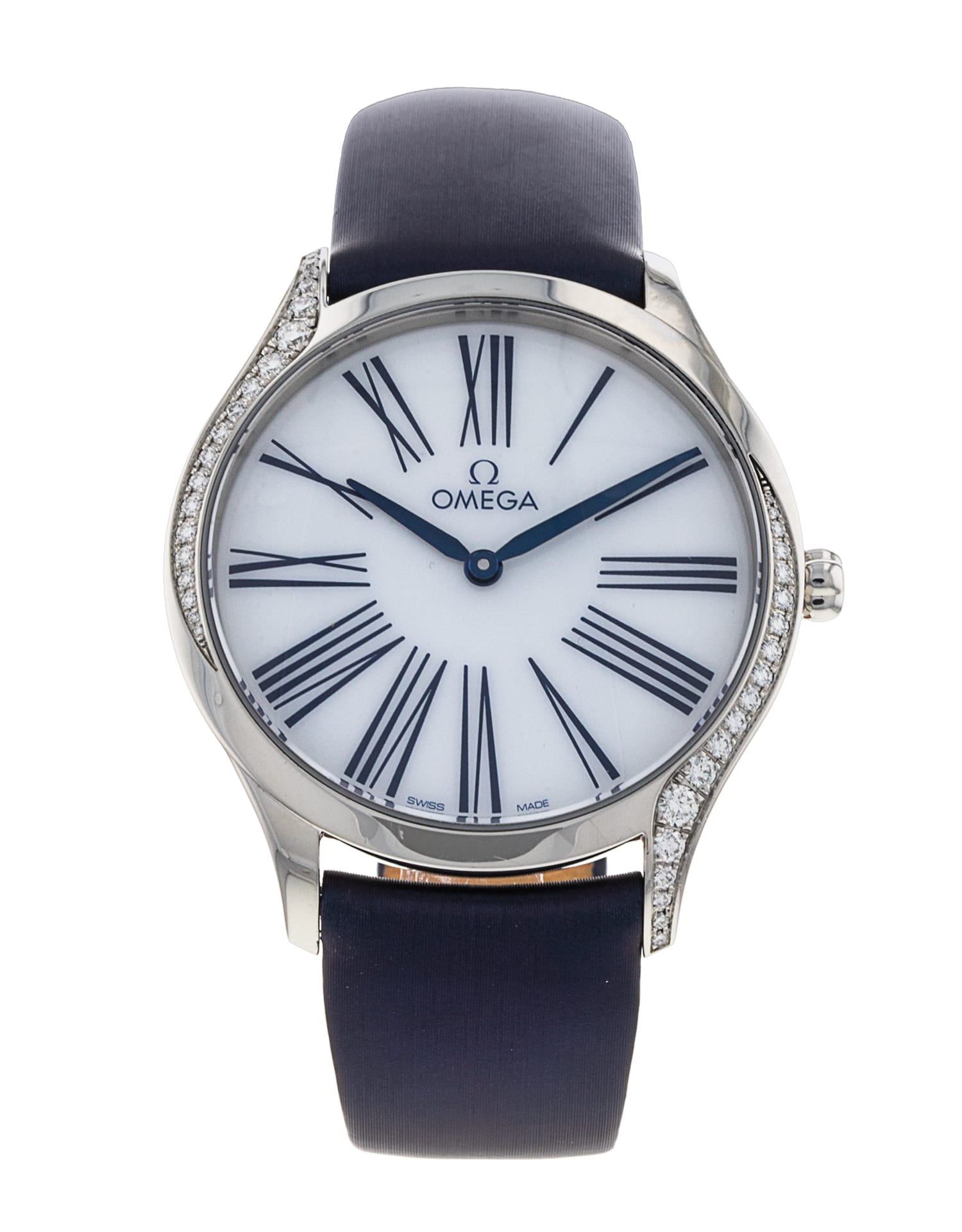 This Omega De Ville Tresor 428.17.36.60.04.001 has a white roman numeral dial and a fabric strap. This Omega has undergone a thorough inspection of accuracy, functionality and condition at our Omega certified service centre to determine the level of reconditioning required to meet our strict standards. It has also been checked against our records to ensure authenticity. All our watches have a 24-month warranty for your peace of mind.