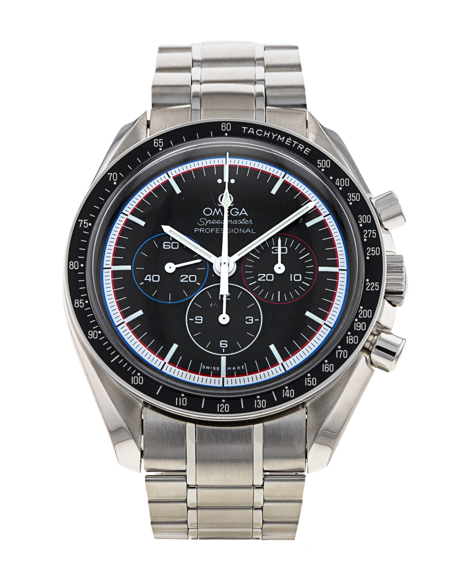 This special limited edition Speedmaster was made by Omega to commemorate the 40th anniversary of the Apollo 15 moon mission. This was the fourth moon landing, during which astronauts David Scott and James Irwin spent several days on the surface and were the first to use the famous Lunar Roving Vehicle—all the while wearing their Speemasters. An illustration showing the astronauts in the so-called “moon buggy” is engraved prominently into the caseback on this timepiece, while the dial features a minute track and subdial decorated in red, white and blue. As well as being patriotic, these were the colours of the Apollo 15 mission patch.