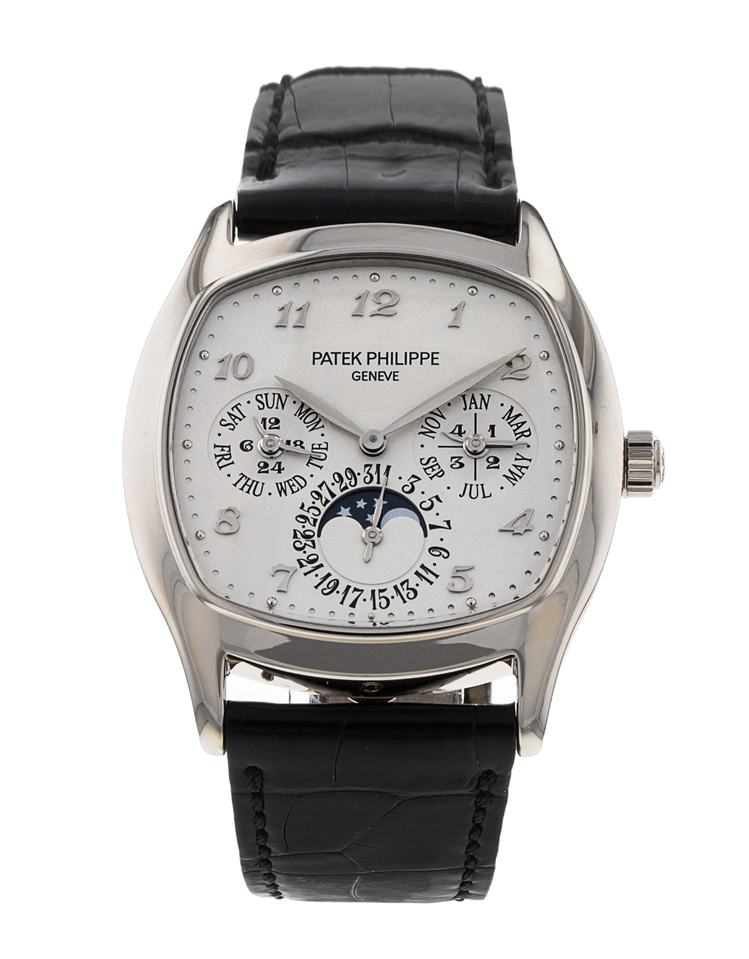 This Patek Philippe Grand Complications 5940G-001 has a silver arabic dial and a leather strap. This Patek Philippe has undergone a thorough inspection of water resistance, accuracy, functionality and condition to determine the level of reconditioning required to meet our strict standards. It has also been referenced against technical documents and manufacturer records where available to ensure authenticity and a clean history. Our watches have a 24-month warranty for your peace of mind, in conjunction with any remaining manufacturer’s warranty from new or from service.