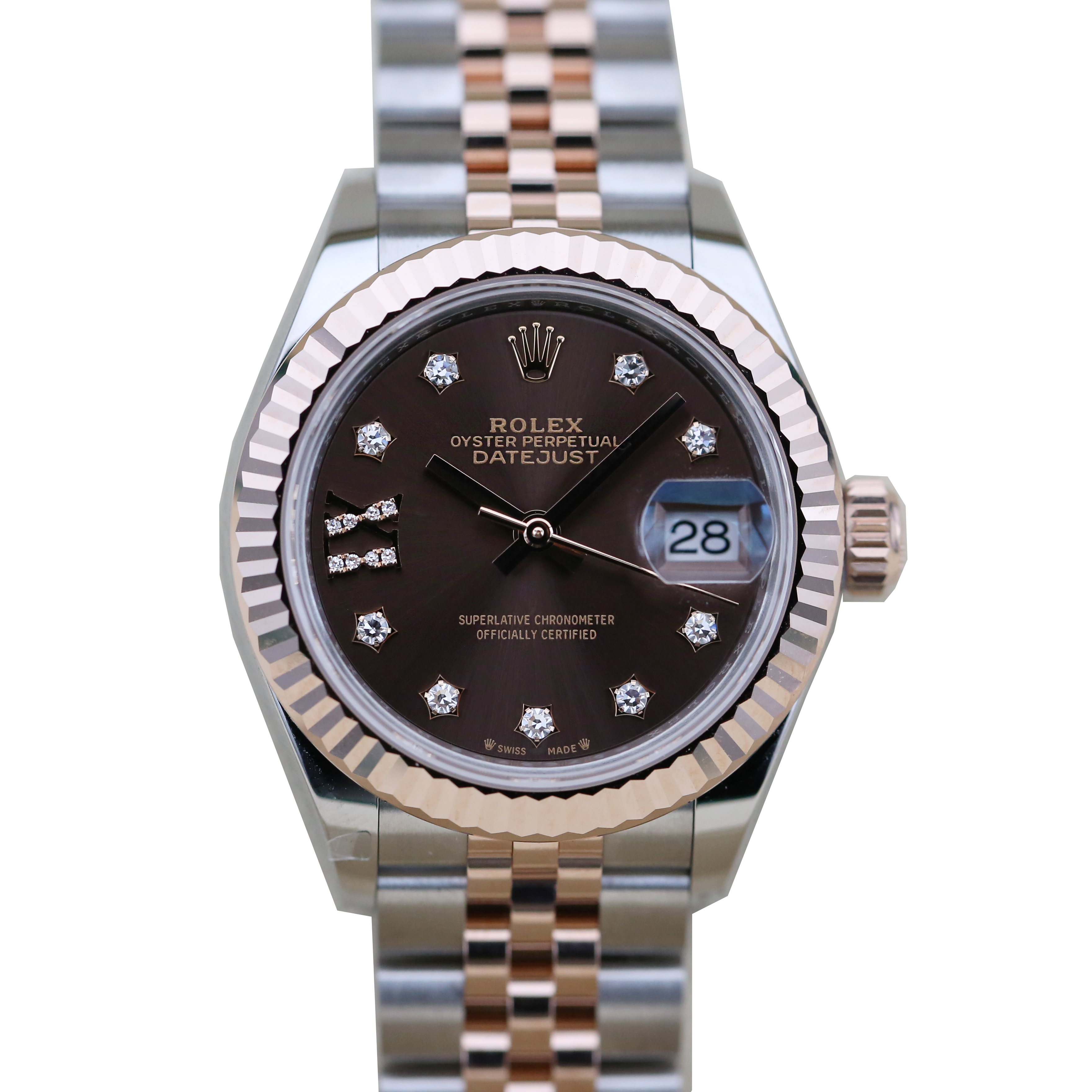 This Rolex Datejust Lady 28 279171 has a chocolate diamond dial and a bracelet strap. This Rolex has undergone a thorough inspection of water resistance, accuracy, functionality and condition to determine the level of reconditioning required to meet our strict standards. It has also been referenced against technical documents and manufacturer records where available to ensure authenticity and a clean history. Our watches have a 24-month warranty for your peace of mind, in conjunction with any remaining manufacturer’s warranty from new or from service. To maintain the manufacturer’s warranty on this watch, it has not been polished in our service centre.