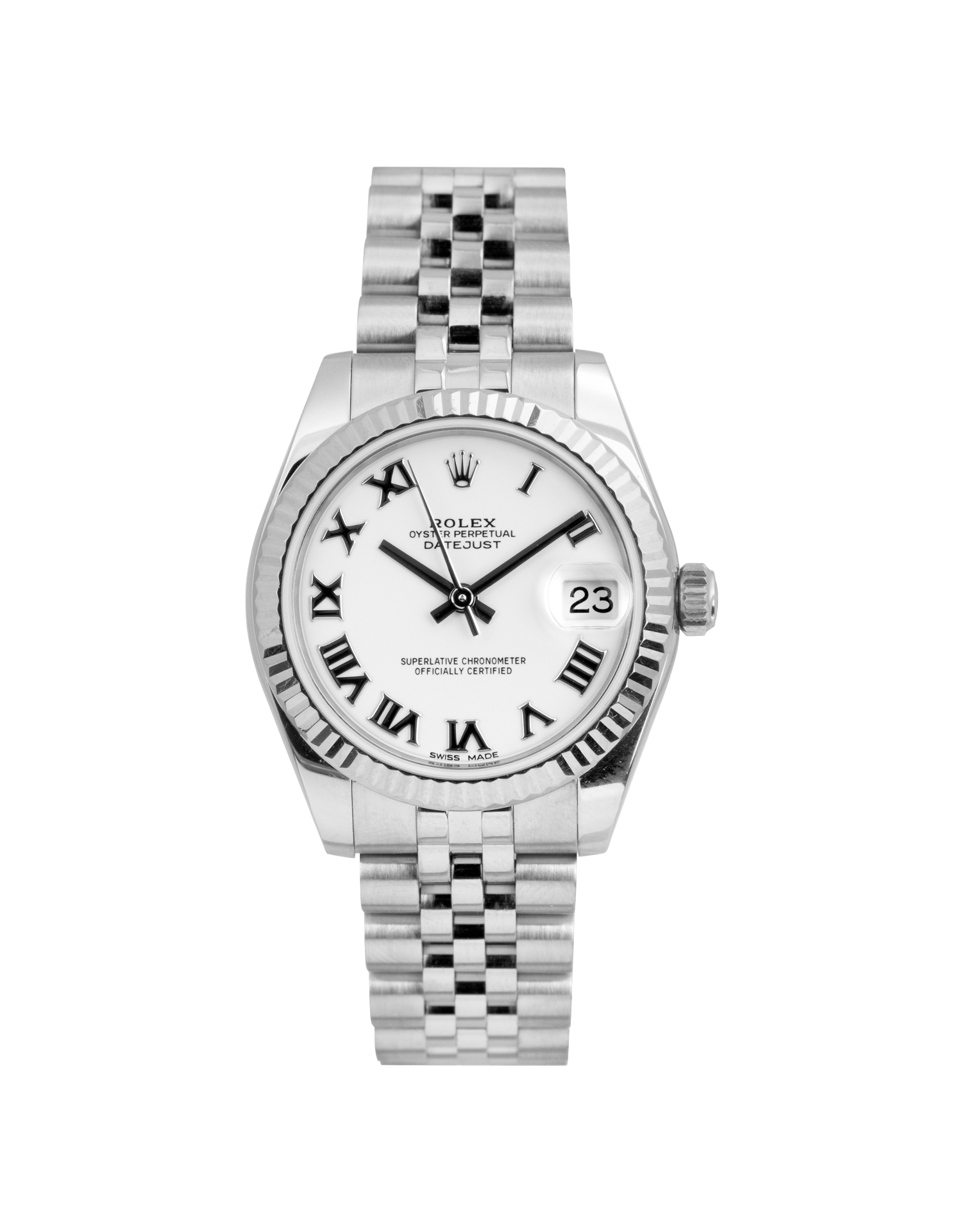 This Rolex Datejust Lady 31 178274 has a white roman numeral dial and a bracelet strap. This Rolex has undergone a thorough inspection of water resistance, accuracy, functionality and condition to determine the level of reconditioning required to meet our strict standards. It has also been referenced against technical documents and manufacturer records where available to ensure authenticity and a clean history. All our watches have a 24-month warranty for your peace of mind. One of our skilled polishing technicians has removed marks on the case and bracelet of this watch, brought about by daily wear and tear, which is why this watch does not come with the remaining manufacturer’s warranty.