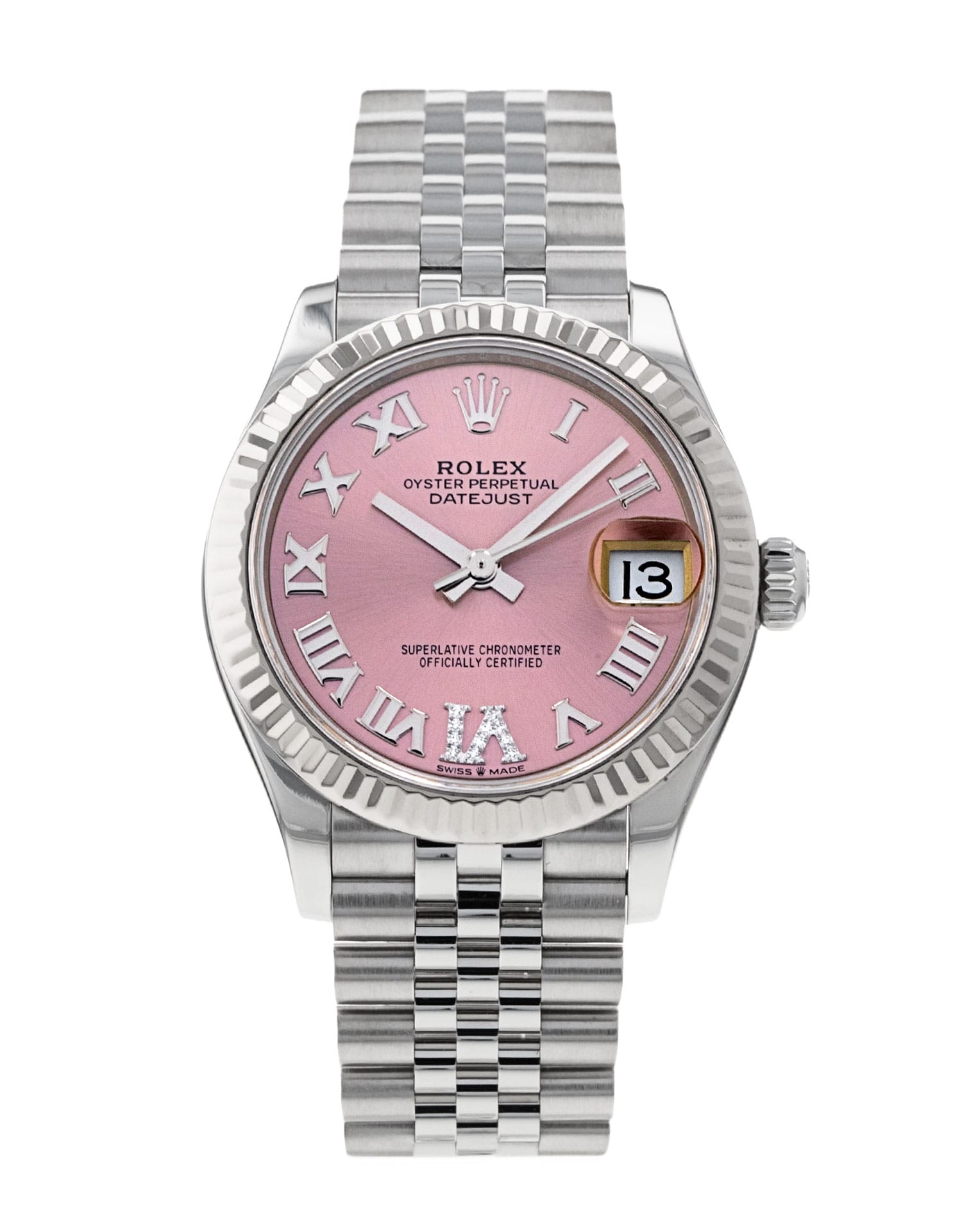 This Rolex Datejust Lady 31 278274 has a pink roman numeral diamond dial and a bracelet strap. This Rolex has undergone a thorough inspection of water resistance, accuracy, functionality and condition to determine the level of reconditioning required to meet our strict standards. It has also been referenced against technical documents and manufacturer records where available to ensure authenticity and a clean history. All our watches have a 24-month warranty for your peace of mind. One of our skilled polishing technicians has removed marks on the case and bracelet of this watch, brought about by daily wear and tear, which is why this watch does not come with the remaining manufacturer’s warranty.