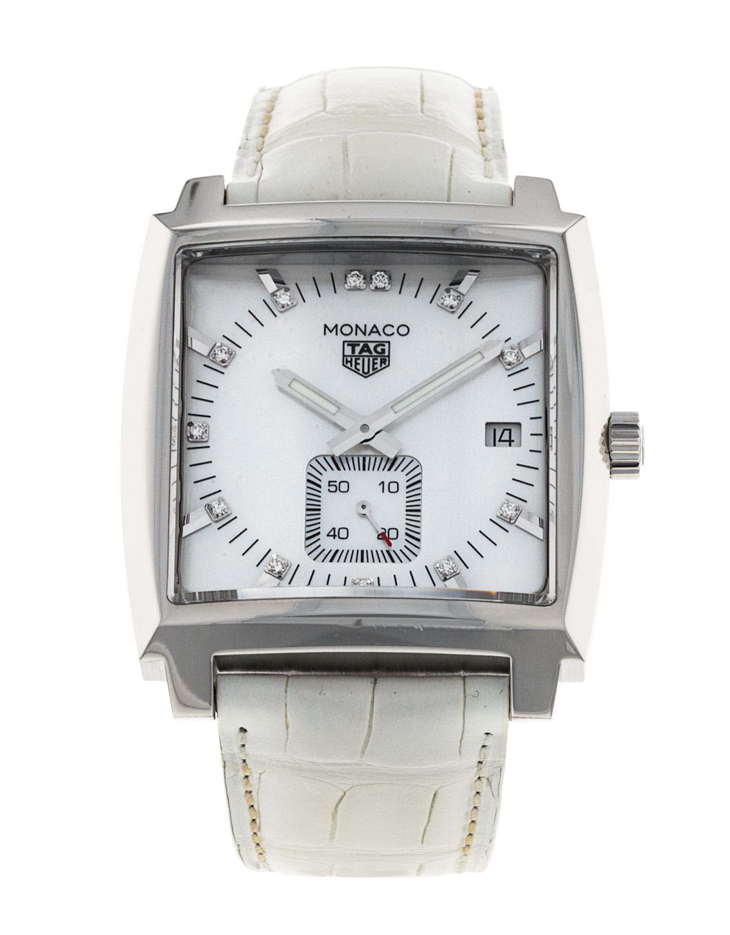 This Tag Heuer Monaco WAW131B.FC6247 has a mother of pearl white - diamond dial and a leather strap. This Tag Heuer has undergone a thorough inspection of accuracy, functionality and condition at our Tag Heuer certified service centre to determine the level of reconditioning required to meet our strict standards. It has also been checked against our records to ensure authenticity. All our watches have a 24-month warranty for your peace of mind.