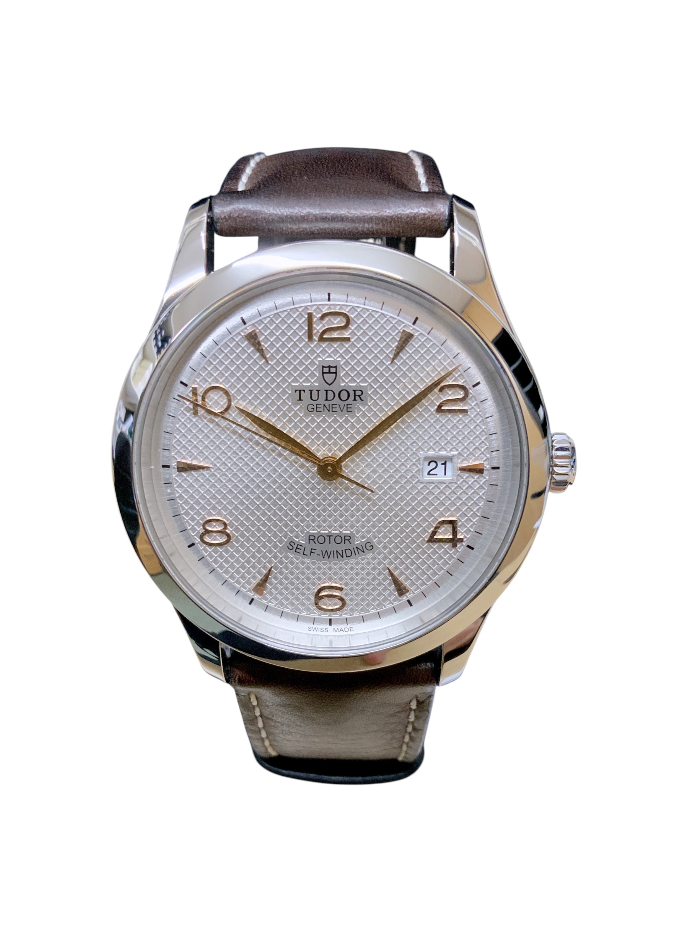 This Tudor 1926 M91650-0006 has a silver arabic dial and a leather strap. This Tudor has undergone a thorough inspection of water resistance, accuracy, functionality and condition to determine the level of reconditioning required to meet our strict standards. It has also been referenced against technical documents and manufacturer records where available to ensure authenticity and a clean history. Our watches have a 24-month warranty for your peace of mind, in conjunction with any remaining manufacturer’s warranty from new or from service. To maintain the manufacturer’s warranty on this watch, it has not been polished in our service centre.